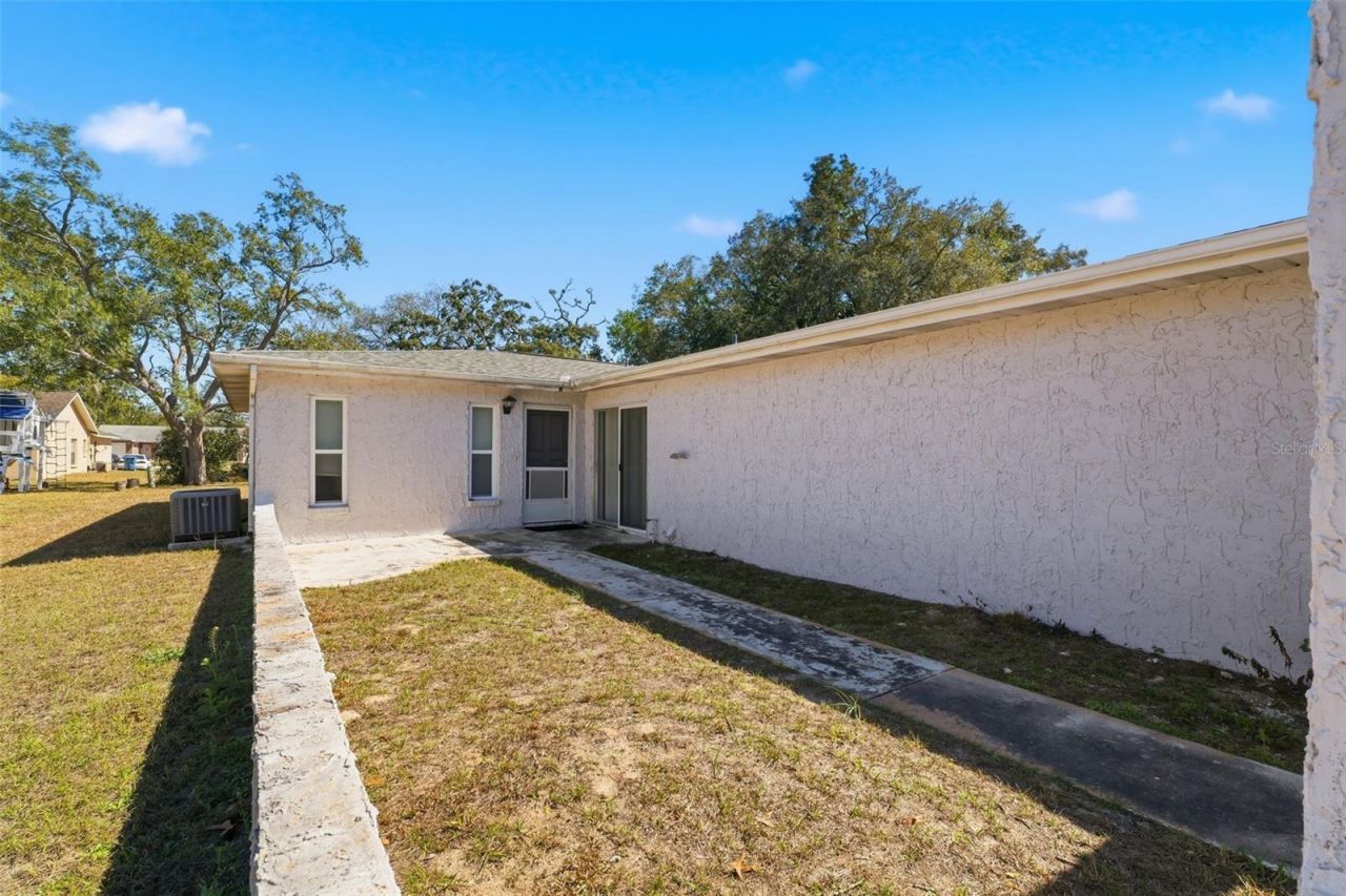 One or more photo(s) has been virtually staged. Set on a 0.23-acre lot with open lawn and mature trees providing natural shade, this well-positioned duplex offers a total of 4 bedrooms, two 2 bathrooms, and 2 half baths, along with 2 separate 1-car garages, creating flexibility forextended living arrangements, rental income, or occupying one side while leasing the other. The front elevation presents a clean, balanced design with two garage doors centered side by side, a wide driveway for convenient access, and privacy walls that frame each entry courtyard, giving both units a sense of separation and personal outdoor space. As you step inside, tile flooring carries you through the main walkway, with the kitchen set both sides and the living area unfolding straight ahead, making the layout feel practical and easy to navigate. The kitchen is arranged in an L-shape with wood-look cabinetry, upper and lower storage, laminate flooring, and a dual sink, flowing naturally into the dining space where a sliding glass door opens to the side courtyard, allowing natural light to brighten everyday meals. The living room extends toward the rear and connects directly to the backyard through a large sliding glass door, offering a clear view of the open green space and creating a comfortable setting to unwind at the end of the day. The primary bedroom includes carpet flooring, a built-in closet, and private access to a half bath with tile flooring and a single vanity, while the second bedroom features carpet, two vertical windows that bring in light from different angles, and convenient access to the full bathroom complete with tile flooring and a tub and shower combination. Each garage houses a designated laundry area with washer and dryer hookups, shelving for storage, and an elevated water heater for efficiency. The backyard offers a wide grassy area shaded by established trees, providing room to relax, garden, or simply enjoy the open space, with a small patio just outside the sliding doors for easy outdoor access. Located in Spring Hill, the property is near Weeki Wachee Springs State Park where clear spring waters invite kayaking and paddleboarding, and Pine Island Beach Park for Gulf sunsets and waterfront walks, along with convenient access to shopping, dining, and daily amenities along Commercial Way, making this a property that combines practicality, income potential, and a lifestyle connected to nature.